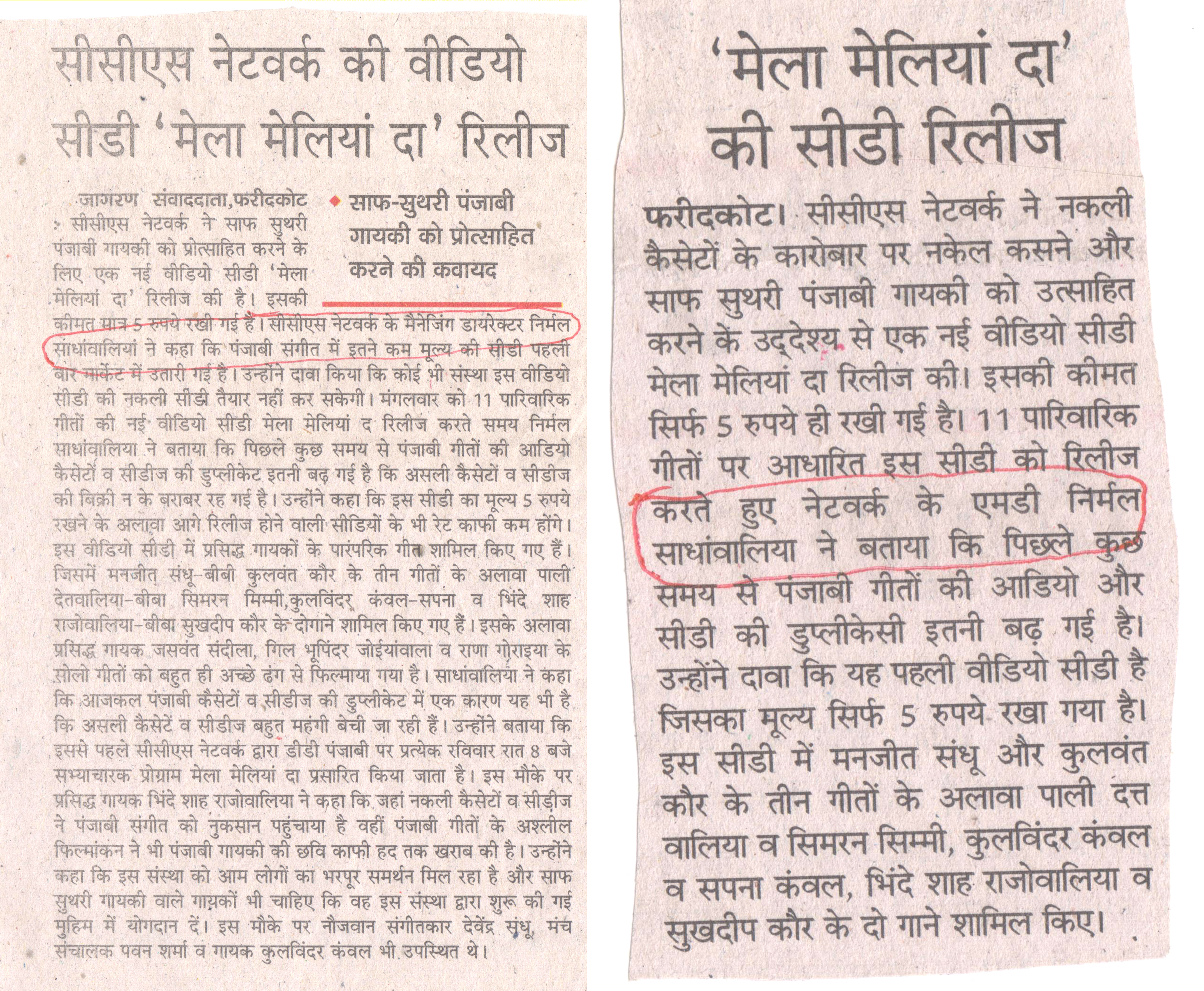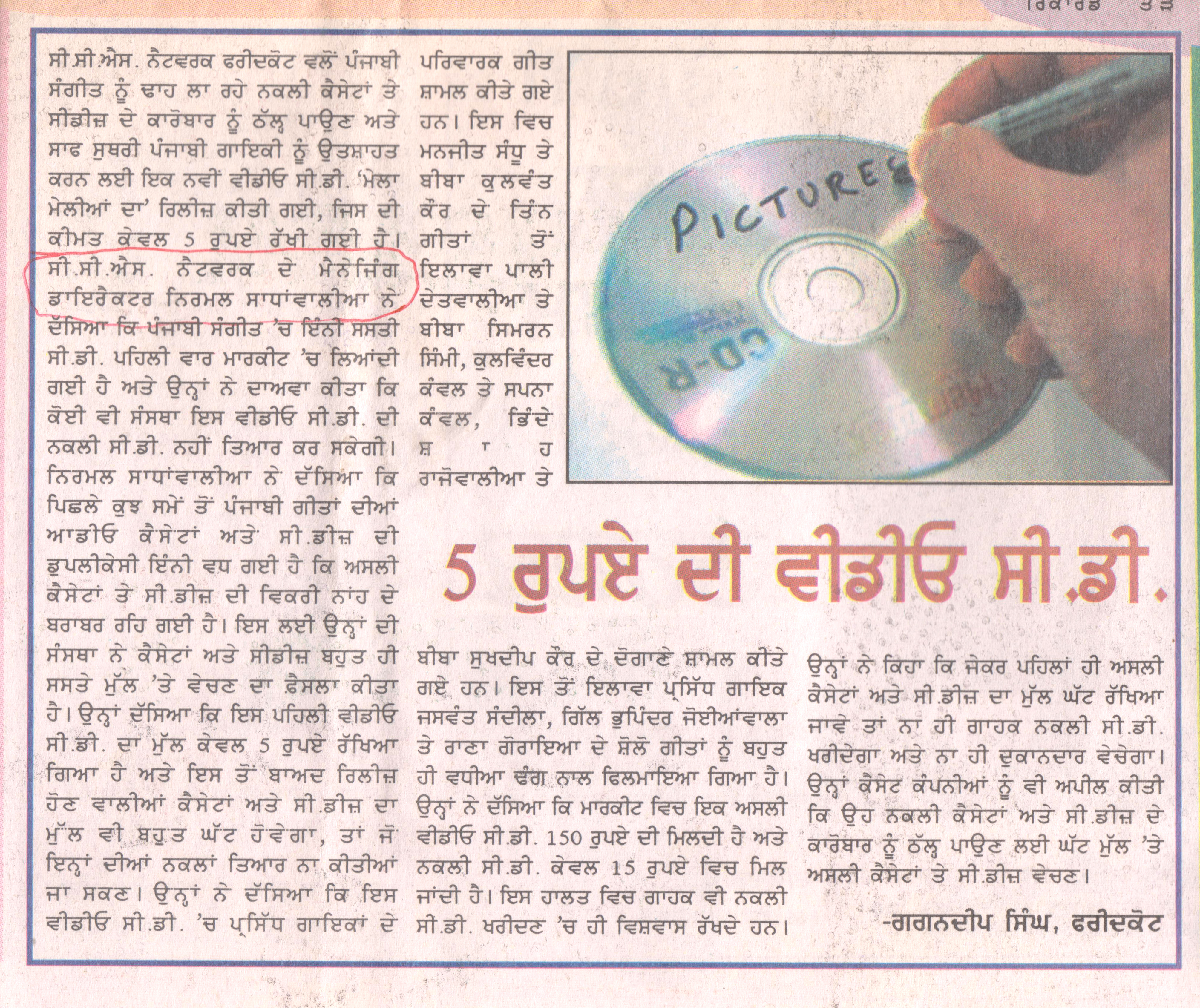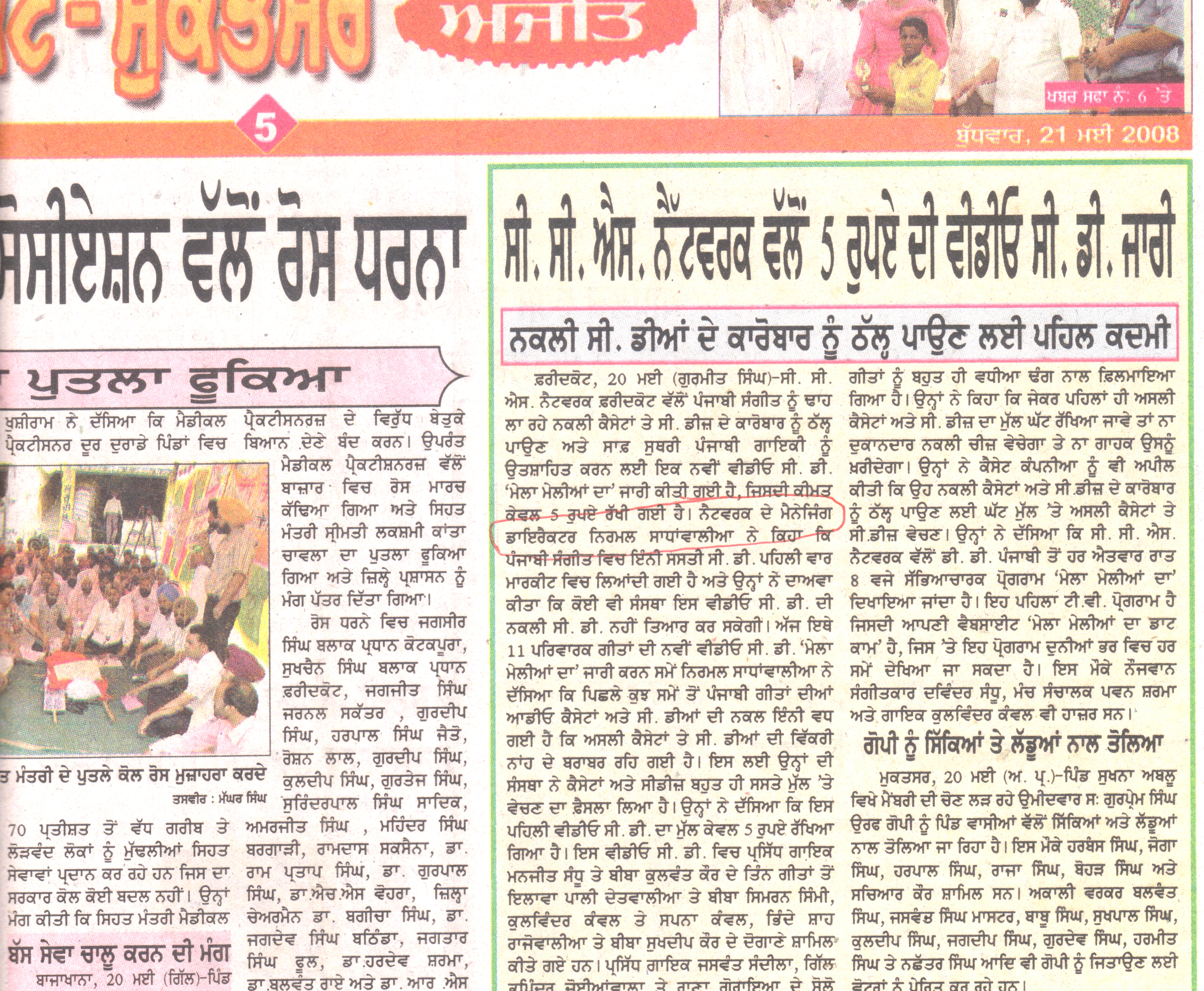 CCS Network released a VCD of Punjabi Music only for Five Rupees.News published in Daily Ajit on May 21, 2008.