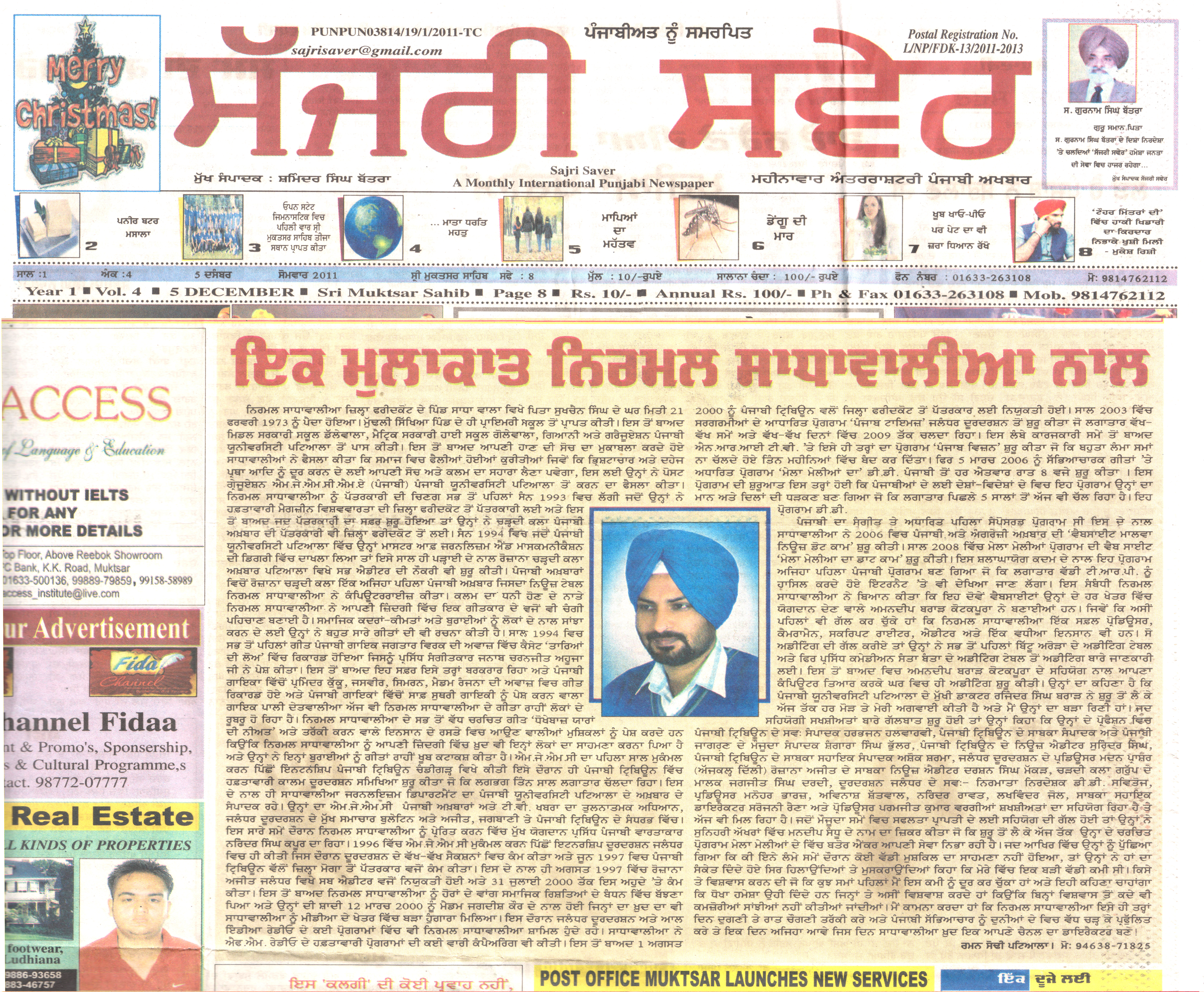 Interview with Nirmal Sadhanwalia by Renowned Journalist Raman Sodhi, published in News Paper 'Sajri Swer'.