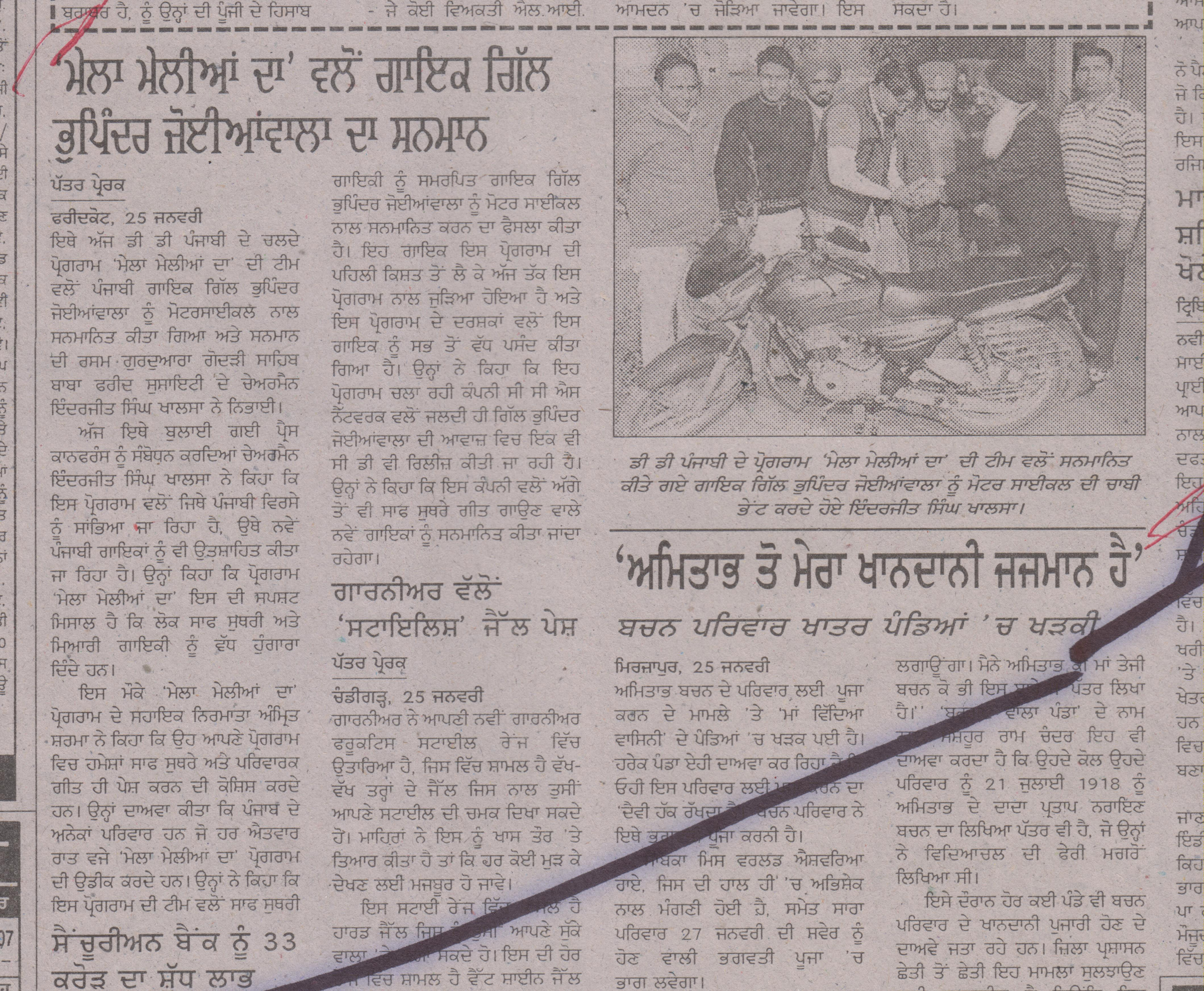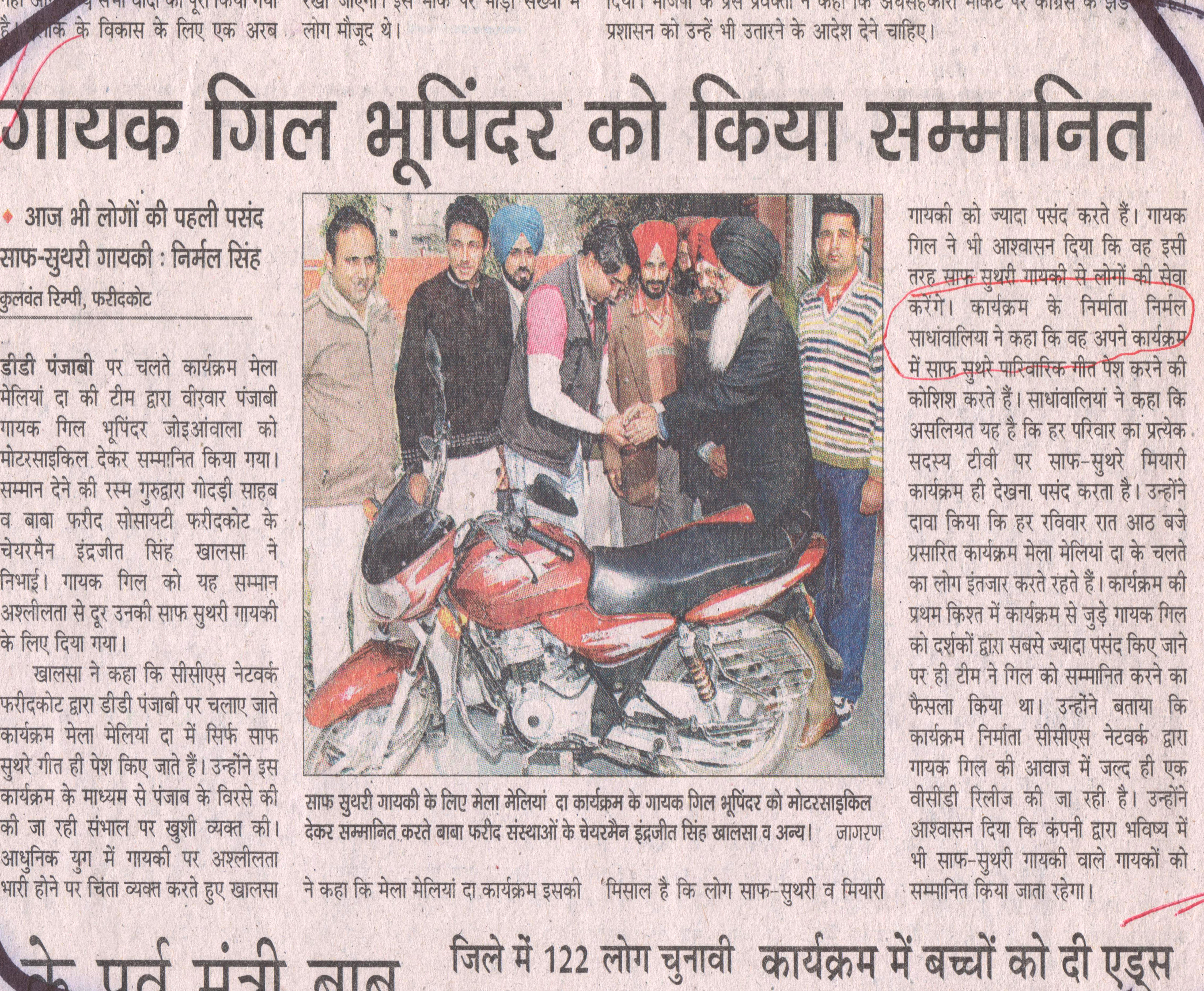 Punjabi Singer Bhupinder Gill honoured by Team Mela Mellian Da and CCS Network. Company awarded a Motorcycle to Bhupinder Gill. News Publishde in Punjabi Tribune on 25 January 2007.